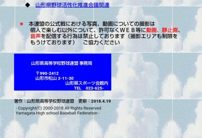 JUGEMテーマ:高校野球 山形県高野連HP http://www5e.biglobe.ne.jp/~yg-koren/ 秋田県高野連HP http://www.akita-koyaren.com/ 東北地区の高野連さんのHPを閲覧すると 写真・動画のWeb配信の 規制のことが掲載されています。 主旨はなんなのか?どこまでの制限があって ペナルティなどあるのか? 2県の高野連事務局へ問い合わせてみました。 禁止の主旨としては先ずは ネットで個人を特定した誹謗中傷など ...