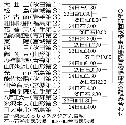 JUGEMテーマ:高校野球 第68回秋季東北地区高等学校野球大会より 学 法 石 川(福島2位)100 300 041=9 (学石)北郷、宗田 能 代 松 陽(秋田3位)000 000 200=2 (松陽)田村、佐藤史、桧森 秋___田 (秋田1位) 001 000 200=3 (秋田)金沢、太田、佐藤光 青 森 山 田 (青森3位) 120 000 21X=6 (山田)三上、坪井 八戸学院光星 (青森1位) 100 111 100=5 ...