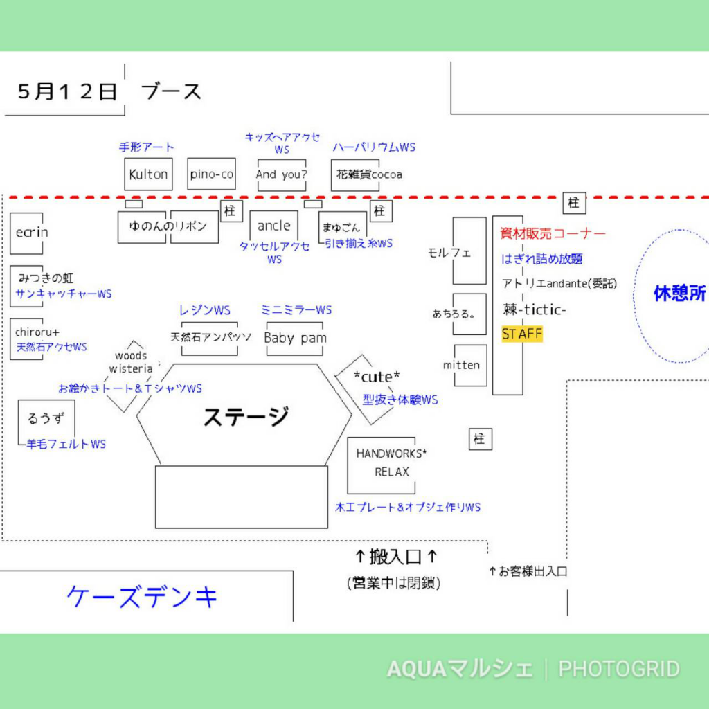 アクアマルシェ番外編の配置図です! アトリエモルフェは資材販売コーナーの裏です🎶 出来る限りの商品は持っていく予定ですが、 展示はできないと思いますのでお声かけください! お待ちしております✨ JUGEMテーマ:バザー、イベント、フリーマーケット