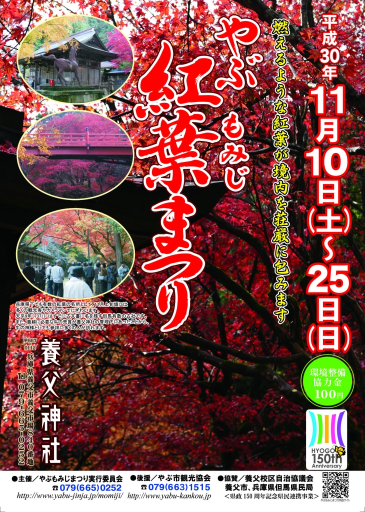 JUGEMテーマ:バザー、イベント、フリーマーケット ★養父神社もみじまつり! 11月10日より養父神社(やぶじんじゃ)にてやぶもみじまつりが開催されます! 兵庫県下でも有数の紅葉の名所として、11月中旬ごろには多くの観光客やカメラマンでにぎわいます。 ぜひ、ご友人・ご家族と養父神社の紅葉をお楽しみ下さい! とっても綺麗で日本の風情を感じる事ができますよ! 日程:平成30年11月10日(土)〜25日(日) 会場:養父神社 境内 (養父市養父市場840) 料金: <普通車> 当日のみ:大...