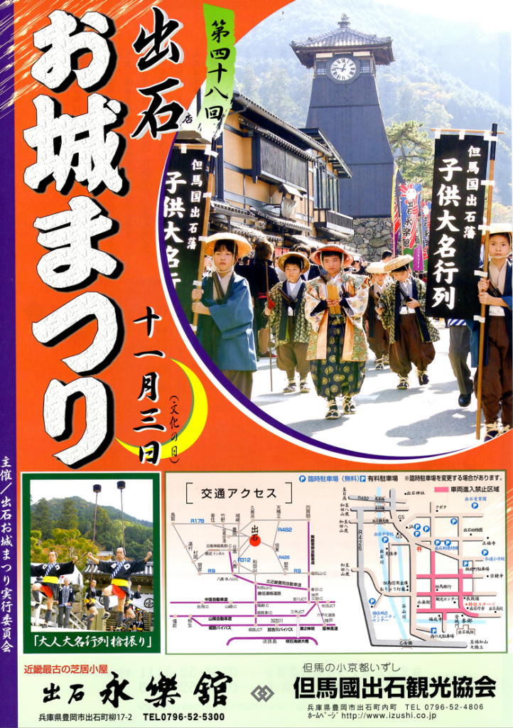 JUGEMテーマ:バザー、イベント、フリーマーケット ★11月3日『第48回 出石お城まつり』 毎年恒例の同まつりは出石町を象徴する祭りで、総勢120人の子供大名行列と、奴に扮した約30人の大人大名行列槍振りが多数の露店が立ち並ぶ町中を練り歩く姿が見どころとなっている。子供大名行列ではきらびやかな衣装を身に着けた殿様、奴、小姓などに扮した子どもたちが行列に花を添える。また、大名行列槍振りは出石藩主・仙石久利公の奥方のお国入りに随伴した赤坂奴が、当時の町衆に技術を伝授したものと言われており...