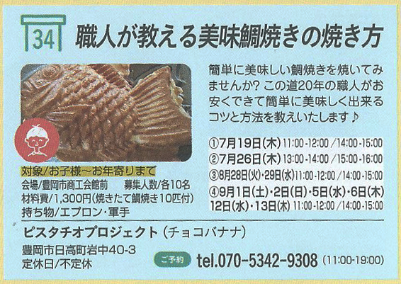 JUGEMテーマ:バザー、イベント、フリーマーケット ※職人が教える美味しい鯛焼きの焼き方を学びませんか? 簡単においしいたい焼きを焼いてみませんか? この道20年の職人がお安くできて簡単に美味しく出来るコツと方法を教え致します! 日程:(ご予約状況) 7月19日(木)11:00〜12:00【2名】 7月19日(木)14:00〜15:00【2名】 7月26日(木)13:00〜14:00【7名】 7月26日(木)15:00〜16:00【0名】 8月28日(火)11:00〜12:00【0名】 8月28日(火)14:00〜15:00【7名】 8月29日(水)11...