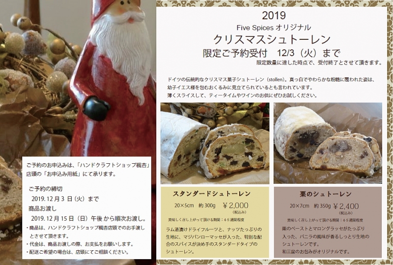 今年も、厳選素材のスウィーツショップ 『Five Spices(ファイブスパイス)』の『シュトーレン』の予約開始です。 一切れずつ、クリスマス🎄に向けてゆっくり楽しむ、 素材の旨みがギュッとつまった、美味しいシュトーレン。 日を追うごとに、しっとりと味に深みが出てくる Five Spicesのシュトーレンは絶品!✨ 毎年楽しみにしてくださるお客様がたくさんいらっしゃいます。 ●ナッツやドライフルーツがつまった 「スタンダードシュトーレ 2000円(税込)」 ●...