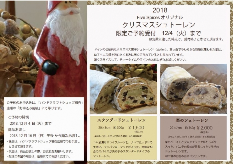 今年も、厳選素材のスウィーツショップ 『Five Spices(ファイブスパイス)』の『シュトーレン』の予約開始です。 一切れずつ、クリスマスに向けてゆっくり楽しむ、 素材の旨みがギュッとつまった、美味しいシュトーレン。 日を追うごとに、しっとりと味に深みが出てくる Five Spicesのシュトーレンは絶品! 毎年楽しみにしてくださるお客様がたくさんいらっしゃいます。 ナッツやドライフルーツがつまった ●「スタンダードシュトーレン 1600円(税込)」 栗の香り...