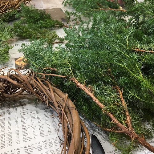 今年もフレッシュクリスマスリース作りにいってきました。 豊中のEDUCEさん(沖原麻友香さん主宰) もう今年で5年目?いろんなパターンのものを作ってきましたが 年一度とはいえ、さすがにそれだけ作ると慣れてくるもので 針金職人と呼ばれるほどに、、 では写真でご覧ください。 フレッシュグリーンと輪っかをそろえ針金でぐるぐる巻いていきます。(雑な説明) 針金ぐるぐる真剣な私 巻き終わったら飾りを選んで出来上がりをイメージしていきます。(さらに雑な説明) 完成写真の前に クリスマス...