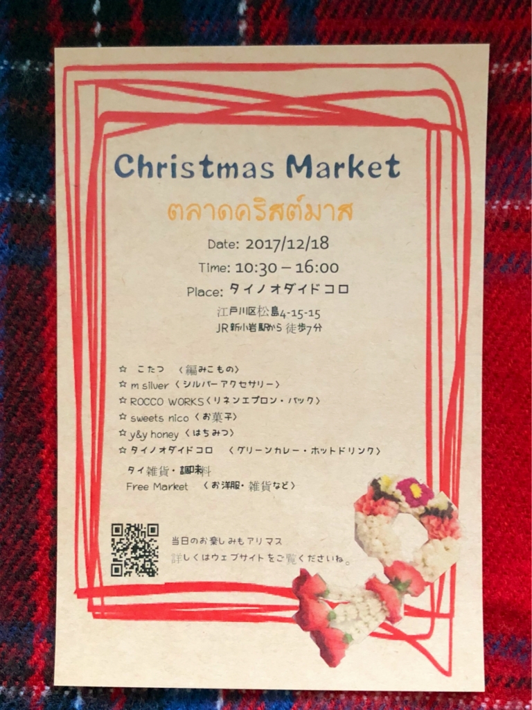 もうすぐ12月 色々と忙しく、寒くもなってきちゃいましたが 寒さも吹き飛ぶ! 楽しくほかほかになるイベントのお知らせです 素敵な作家さん達に来ていただき、美味しいもの、タイの調味料、 フリーマーケットなど盛りだくさんのクリスマスマーケットを開催します 1年間頑張ったご自分へのご褒美に、 お子様、お友達へのプレゼントに是非☆ 一つ一つ手作り、1点ものの素敵なものたちが 並びますよ Date: 201...