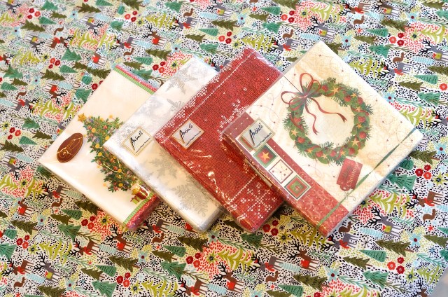 Xmasパーティにあると便利♪ Xmas柄のペーパーナプキン デコパージュの素材として使うのにもおススメ 明日、マルクトにお持ちしますね☆ 20枚入り ¥682 ⇒ ¥546 (20%off ・税込) 下に敷いてあるXmas柄の生地もカットクロスで持っていきます。 全3色 110cm幅×50cmカットクロス ¥800 (税込) テーブルクロスとして使ったり、ポーチや巾着に仕立ててプレゼントをラッピングするのにもいいですよ。 ※数に限りが...