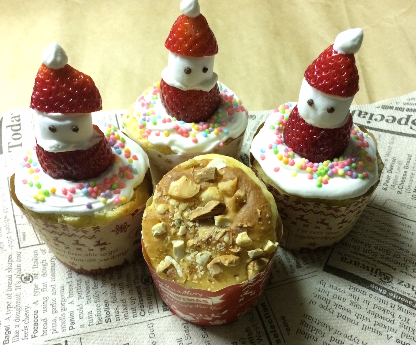 JUGEMテーマ:クリスマス あっというまにクリスマスイヴがやってきましたね 22日に、ほぼ半日かけて、カップケーキとクッキーをオーブンフル稼働で焼き デコレーションしたりラッピングをしました (写真を撮るころには疲れてしまい、背景がザツです ) サンタ三兄弟 左の子の帽子がちょっと大きい(笑) いちごの帽子と洋服、顔はマシ...