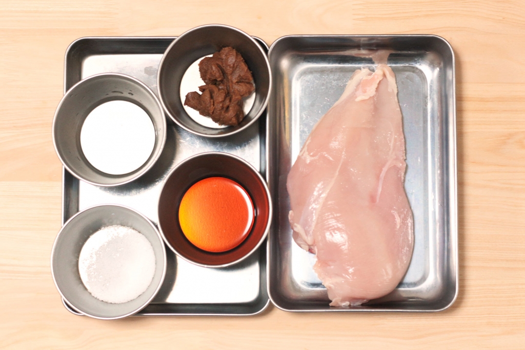 【実験レシピ情報】こんにちは!味噌専門店 坂本商店です。 ブレンド味噌を使ったレシピです。 数年前にネットで話題になり、すでに定番となった鶏ハムを、今回は味噌を使って作ります。 手順は少しありますが常備菜として作っておくと、お料理としてもトッピングの具材としても便利です。 材料: 鶏胸肉 1枚(皮は取ります) 味噌 大2(ブレンド味噌を使用) 酒 大1 しょうゆ 小1 砂糖 小2