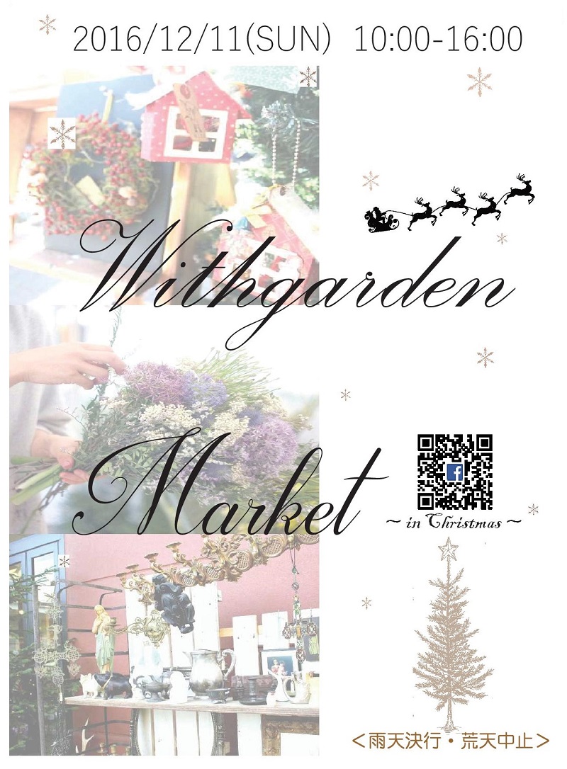 2016/12/11(sun) 10:00-16:00 「Withgarden Market 〜in Christmas〜」 イーアスつくば内 Withgarden Tsukuba ウィズガーデンつくば前広場 Withgarden Tsukuba http://withgarden.sakataengei.co.jp/ 『 家 貨 屋 』kakaya ka-ka-ya.com <雨天決行・荒天中止> 古い文化と新しい文化が混在する、つくば市の街中で、アンティークや古道具などのオシャレで懐かしいものから、洗練された新しいアート・クラフト作品の展示販売、おいしいフード・カフェまで、ジャンルを超...