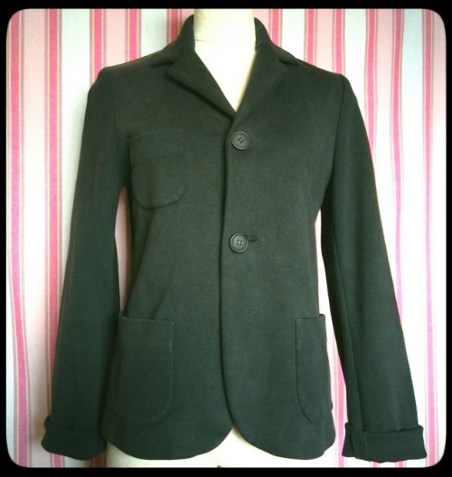 90年代のA.P.C. アーペーセー 黒に近いほど濃いカーキ色の コットン・ニット素材のジャケットです。 軽く起毛してある生地なので、 ソフトで、ちょっとしっとりしたような質感で、 体になじんで着やすいです。 とてもシンプルなジャケットなのですが、 やはり、なにかが違う! さすがA.P.C.アーペーセー。 まず女物で、 ここまで無駄をそぎ落とした、 男物の様な形で、 装飾の無いジャケットをを見つけるのが難しいです。 でしたら、男物を着れば? と思う方もいるかもしれませんが、 男物ですと...