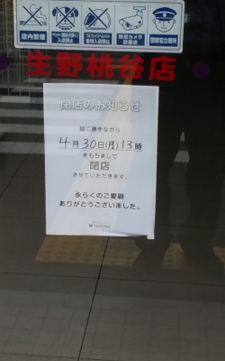JUGEMテーマ:コンビニ まずはこの記事を 「2016.08.31の記事」 この日、颯爽と開店した 「サークルK・生野桃谷店」が 昨日閉店しました。 多くの「サークルK」がたどった道 「ファミリーマートへの移行」もなく 全くの閉店です。 わずか1年8ヶ月! 何のための開店だったのか・・・・ お疲れ様でした。 コンビニの閉店なんて、珍しくも何ともないのですが やっぱり寂しいですね。