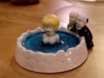 十五夜 そうです明日はお月見の十五夜です 十五夜と書くとうさぎさんぴょんぴょんなのに 15の夜と書くと、盗んだバイクで走り出す人が出てくる フシギ そんな訳で今回ご紹介は 何を見てるのかな?の灰皿です 二人仲よさそうに女性の入浴を見つめています 頬杖ついて見てるところが可愛いおっさん二人 これは覗きなのか 覗きなら犯罪だぞぅ! 視点を変え...