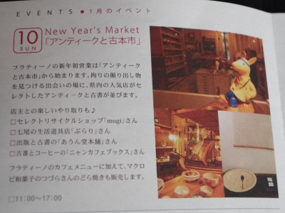 みなさんあけましておめでとうございます 今年は3日から開けるという偉業を達成いたしました mugi氏のヤル気を溢れ出さんばかりに感じております ほんとは年末ジャンボが当たってしばらくお店を休む計画だったんですが 3日から開けるという事はお察しの通りでございます 600円ゲットいたしました スタッフにお年玉として献上しておきました そんな訳で地道に頑張らないといけないということで 今週末の日曜日 駅西本町のフラティーノさんで行われる「アンティークと古本市」に出店致します 七尾の...