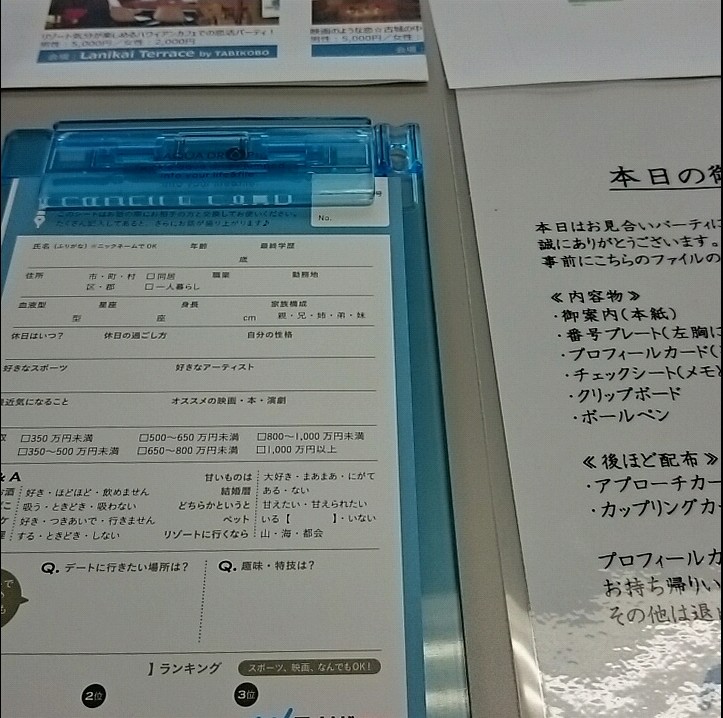 前回の続きです。 席に着いて、 配布物の確認です。 こんな感じ↓ ・本日の予定紹介チラシ ・プロフィールカード ・マイナビ婚活パーティーのチラシ ・番号札 ・マイナビ婚活アプリの紹介チラシ といった感じです。 そんなわけで、 思いがけなく一番乗りをした私は、 取りあえずプロフィールカードの記入です。 マイナビ婚活の プロフィールカードは、 ちょっと独特です。 結構迷ったのは、 ・最近気になること ・私の【 】ランキング 1位 2位 3位 という2項目です。 ...
