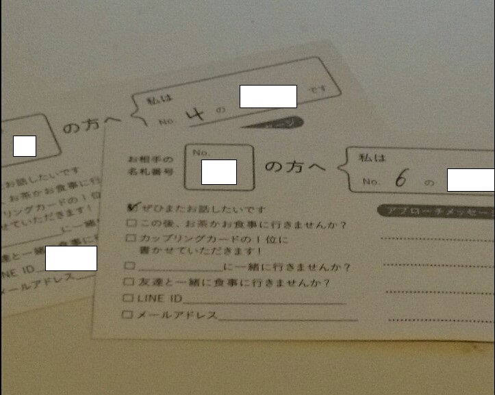 前回の続きです。 当然ラインIDには 自分のIDを書いておきました。 それから5分後。 回収したアプローチカードを それぞれの方にお渡しをし始めました。 私も2人の女性から アプローチカードをもらえました。 こちらです↓ よかった〜。 もらった女性は、 4人目の女性と6人目の女性です。 6人目の女性はともかく、 4人目の剛力彩芽似の女性は本命だったので、 非常に嬉しかったです。 しかも4人目の女性がくれた アプローチカードには、 コメント欄に お...