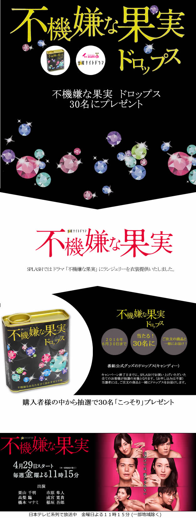 2016年4月29日から放送スタートしたTVドラマ『不機嫌な果実』。 SPLASHからは、女優の栗山千明さんや橋本マナミさん向けにランジェリーを衣装提供しました。 ドラマ放送を記念して「不機嫌な果実ドロップス」が当たる抽選キャンペーンを実施いたします! 本日から6月30日までの間にSPLASHで商品をご購入いただいたお客様の中から 抽選で30名様に、番組公式グッズ「不機嫌な果実ドロップス」をプレゼント。 抽選の対象は、お買い上げ金額にかかわらず、キャンペーン期間中に SPLASHでご購入いただいたお客様すべ...
