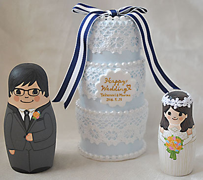 お二人の思い出の場所をマトリョーシカに♪ ロマンティックな夕焼けに染まる海辺を再現。 背面には江ノ島を。 新郎様は紋付袴、新婦様は色打掛で 和装姿で。中サイズ3個組での制作。 JUGEMテーマ:ウェディングドレス&ウェディング小物