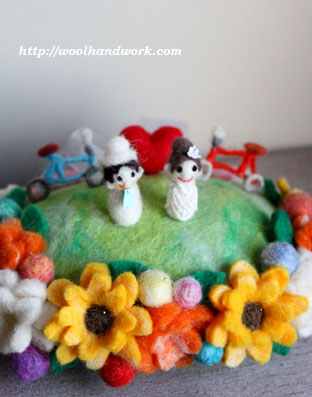 JUGEMテーマ:ウェディングドレス&ウェディング小物 テーマ…「お2人の共通の趣味=自転車」「赤いふっくらしたハートを2人と自転車の間に」 「周囲のお花は、黄色やオレンジを使って、元気な感じに」 「羊毛フェルトのちび玉もカラフルに、沢山飾ってほしい」