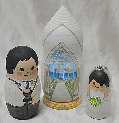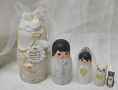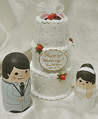 マトリョーシカの形をいかしたケーキタイプ。 新郎新婦さまともに剣道着で。中サイズ3個組での制作。 可愛らしいケーキから凛々しいお二人が中からでてくる 意外な組み合わせ。 JUGEMテーマ:ウェディングドレス&ウェディング小物
