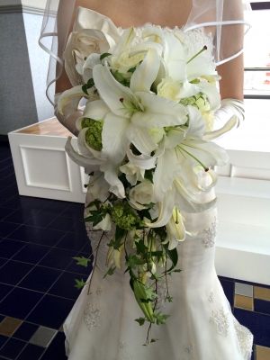 先日、結婚式を控えた友人から奥様のブーケを作って欲しいと ご依頼を受けました。 奥様のご要望は、ウエディングドレス用のキャスケードブーケと カラードレス用のブーケ。 結婚式は幸せなお二人が、あふれる幸せと祝福を受け 輝く大切なイベント。 そのお手伝いをさせて頂くのは、花屋にとってもうれしい事です。 【 キャスケードブーケ 】 「ユリをメインに」とのリクエストでお作りしました。 華奢な新婦様のマーメイドドレスに とってもお似合いでした。 【 キャスケードブーケ 】 お色直しで入...