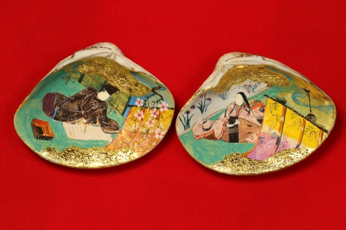 春先から依頼されていた貝合わせが、ようやく完成しました。 貝の大きさが幅12cmと大きいハマグリの内側に総金箔を貼り、左右の貝に「琵琶」を弾く女性と文を見ている男性を描きました。どちらも先方の依頼で、周りに咲く花々も依頼によっています。 この貝合わせは、この秋に結婚式をされるお二人が、式場において来場されて皆様に見てもらい祝福してもらうセレモニーにお使いだそうです。また、この貝合わせは下の8角形の箱「かいおけ、貝桶」に入れて保管されるとの事です。 ど...