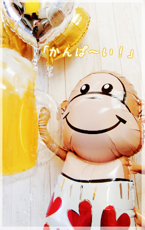 今日はめでたい!特別な日。 お猿のジョージがビールを持ってお祝いに来たよ〜〜 japaneseお祝いカラーの金・銀のハートのバルーンとトップの寿バルーンで言うことなし!間違いなし!のおめでたバルーン電報です。 結婚式や誕生日、還暦祝いなどのバルーン電報、バルーンギフトに 冗談の好きな方へのサプライズギフトにおすすめです 【バルーン電報】寿だよ!全員「かんぱ〜い!」 JUGEMテーマ:私たちだけのオリジナルウェディング