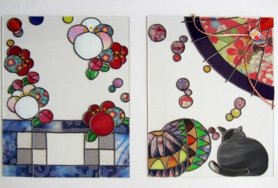 JUGEMテーマ:私たちだけのオリジナルウェディング 「和」をテーマにしたお友達へのプレゼント作品です。2枚構成の作品を3名で制作されました。2枚の間には空間がありますので、その空間を利用して控えめな熨斗があしらわれています。 1枚目は梅と窓。窓からは2枚目の猫と毬がのぞいています。 猫はお友達の家族の一員、アメリカンショートヘアーの特徴をつかんでみました。 其々単体でも豪華な作品ですが、2枚重なるとさらに素敵です。 制作いただいた彼女たち、実は初めての制作ではありません。 和柄フィルムの存在を知...