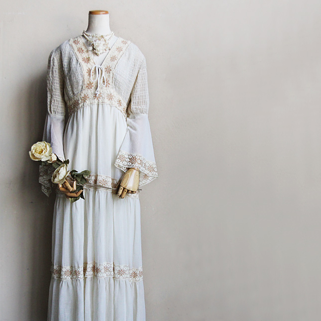 JUGEMテーマ:私たちだけのオリジナルウェディング 70's Vintage Cotton Lace Maxi Dress "ecru" http://stlow.net/?pid=78563309 197年代頃のコットン素材のヴィンテージドレス。 ネックラインはVネックにシャーリングが施され、 花柄のレースが胸元をやさしく飾るデザインです。 また、袖はすらりとした上部から緩やかに広がりを見せるパゴダスリーブ。 上品でエレガントなイメージです。 サイズ感は11-13号くらいで9号のトルソーで少し余裕があ...