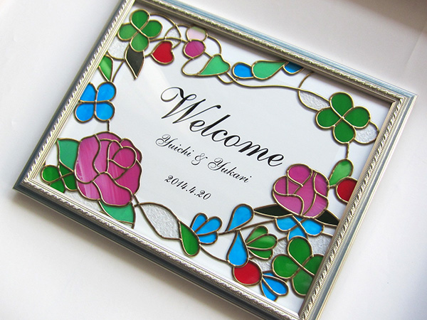 四つ葉のクローバーも、バラと共に人気の高いモチーフです。 小さな丸が手をつないでいるような形で構成されているところがこの作品のかわいいところでもあり、作品の難しさでもあります。それらを丁寧に仕上げられました。 色による強弱だけではなく、透明なフィルムと不透明なフィルムを上手に組み合わせて、リズム感のある作品にまとまっています。 透明感があり、美しい音楽が聞こえてくるようです。 末永くお幸せに