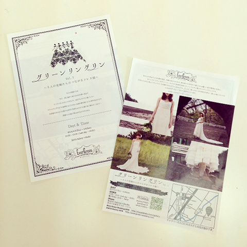 JUGEMテーマ:私たちだけのオリジナルウェディング グリーンリングリンのフライヤー第二弾が刷り上がりました。 花嫁さんや業界の方だけではなく、 デザイナーを志している学生さんたちにも見ていただきたい。 アトリエを開いた当初、何人かの学生さん達から働きたいと連絡を頂いていました。 私たちも始めたばかりで、この先どうなるか分からなかったので お断りしていました。 まだまだ余裕がある訳ではありませんが、学生さんたちが見に来てくれて 私たちの作った空間で何かを感じてもらえたらいいなと。 そ...