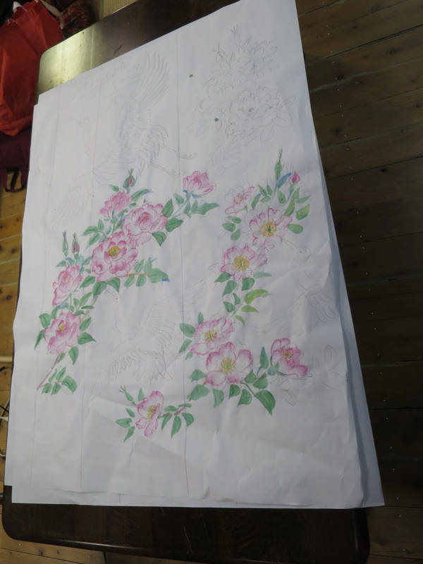 JUGEMテーマ:ブライダル @絽の打ち掛け 素描 薔薇柄 足立茂先生 今 足立茂先生に絽の打ち掛けに 素描で 薔薇のお花を描いてもらっています。 途中だけど 見学に行ってきました。 斜めに 薔薇を配置して頂いたようですが、 一番大切な後姿や 前のイメージー 肩の感じなど 着付けをして お嫁さんの動きなどを含めて このあたりにもう少しと いったイメージで お願いしてきました。