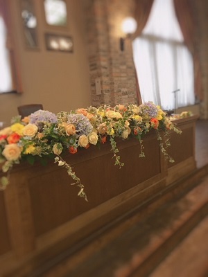 JUGEMテーマ:結婚 台風が通り過ぎ 今朝は青空が広がり風も暖かく まさに秋晴れです。 先週末は雨が降ったり止んだりと、 あいにくの空模様でしたが 会場の中は外の気配を感じない 明るく温かい空気が流れ 花たちも皆、すっごく元気に凛として 今日の佳き日を祝っているように感じました。 秋色紫陽花が美しい季節です。