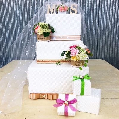 先日スクールのお客様からブライダルアイテムの作成ご依頼がありました。 娘様の結婚式の受付に置くアイテムです。カワ(・∀・)イイ!! 3段ケーキのトップに新郎新婦のイニシャルを乗せています。 各段に造花のアレンジメントをセット!石鹸でできたお花も入っているのでいい香りがします こちらのボックスを脇にセットすることで全体のバランスがまとまります トップのアレンジにはティアラとベールが!(^^)! ケーキと一...