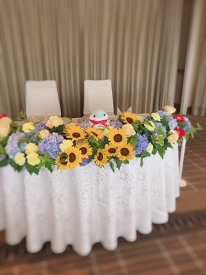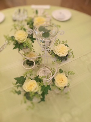 JUGEMテーマ:結婚 黄色のテーブル装花が続いています 何故だろうねぇ(^_-) と、皆で話すのだけれど 本当に重なるのです。 同じ色、同じタイプの装花やブーケ 今日も明日も風船なんてことも 重なるのです。不思議です。 今回はね 黄色のアレンジ 爽やかに飾らせていただきました