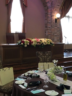 JUGEMテーマ:結婚 椅子が新しくなって、会場が一新 お洒落で豪華な雰囲気が漂います。 紫陽花やダリアを使うと 大人でかっこいい!って感じになります それにしても 紫陽花やダリアって夏の花なのに、 今は、一年中見ることが出来て もちろん、もちろん有難いけれど どこかで、ちょっと淋しい、ちょっと残念、 そんな風にも思う、花屋の端くれです。