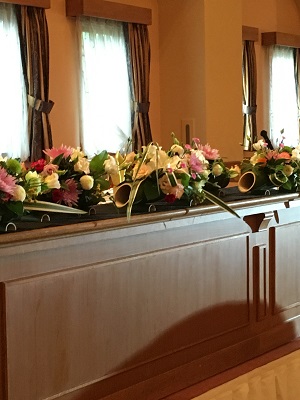 JUGEMテーマ:結婚 夕べから 台風に警戒のニュースがひっきりなしに流れてきます。 あずさも運休だね。 土・日曜日は雨が降らずに良い天気でよかった^o^ 土曜日の披露宴の花は 竹の器を使って 和のテーブルをつくらせていただきました。 いつも短期間で竹の器を作って下さる “バンブーテック”さん (時間がたつと緑の色がさめるてしまうので・・・。) 本当にありがとうございます。 おかげさまで、このアレンジが可能です。 感謝です。