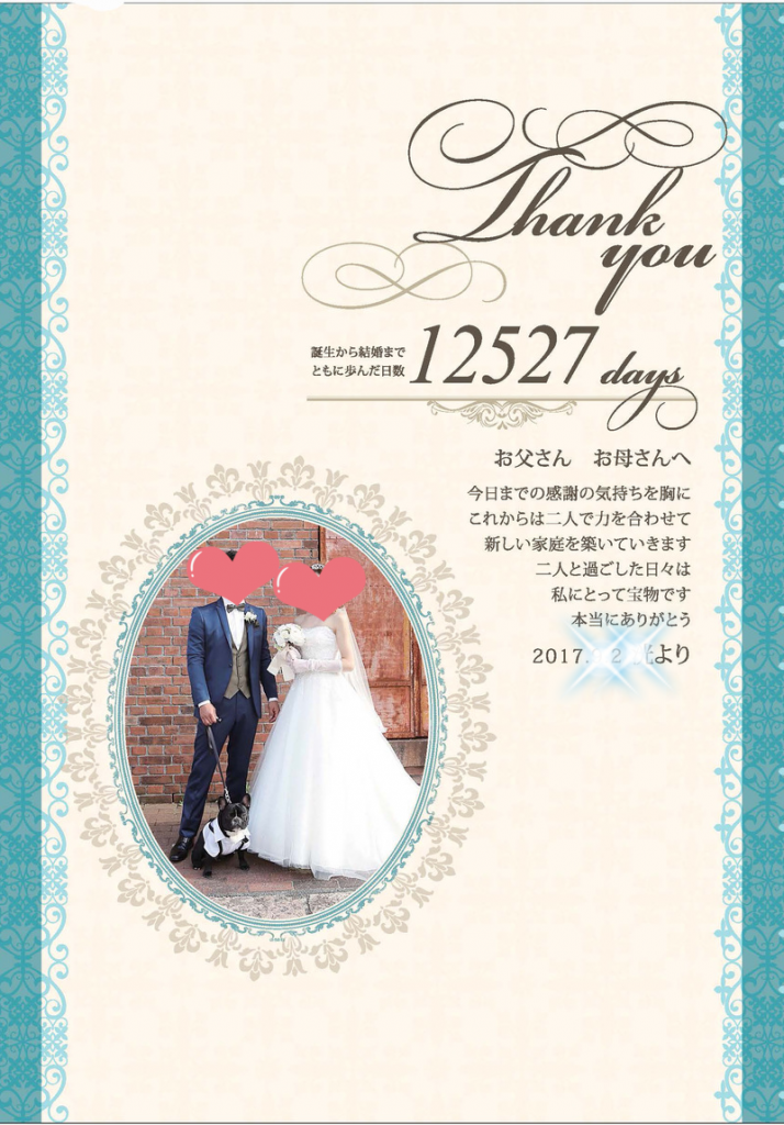 JUGEMテーマ:ブライダルプランナー 披露宴でのワンシーン 今まで育てた来てくれた親御様へ 感謝の気持ちを込めて… 以前では花束贈呈が一般的でした 今では…生まれたときの体重のぬいぐるみ そして似顔絵など 色々なアイテムの中から チョイスしていただけるようになりました その1つが メモリアルボード お二人に写真をチョイスしていただき ...