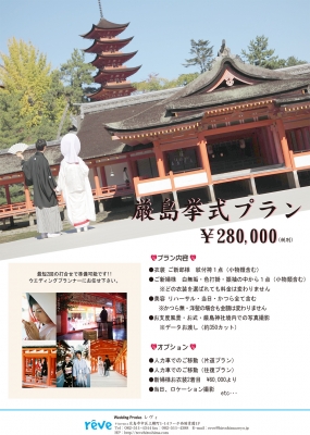 JUGEMテーマ:ブライダルプランナー 今まで、お問い合わせを頂いておりました お客様のみご案内しておりました プランを ホームページにてご案内 http://revehiroshima.com/top こちらから、検索してみてください 厳島挙式をお考えのお二人に ☆☆☆☆☆☆☆☆☆☆☆☆☆☆☆☆☆☆☆☆☆☆☆☆☆☆ なんでもお気軽にご相談ください♪ Wedding Produce レヴィ 〒730-0014 広島県広島市中区上幟町1-14コーポ...