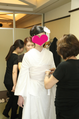 JUGEMテーマ:ブライダルプランナー 白無垢着付のお支度風景 挙式当日、一番にお支度をはじめさせていただくのが 新婦さんです 挙式のスタート時間によっては 早朝からの準備も 白無垢姿を完成するのにかかる所要時間は 2時間半〜3時間 メイクヘアセットに始まり 和装の着付となります 勿論、白無垢の場合は、身に着けていただくお着物は 全て白 そして、着付を...