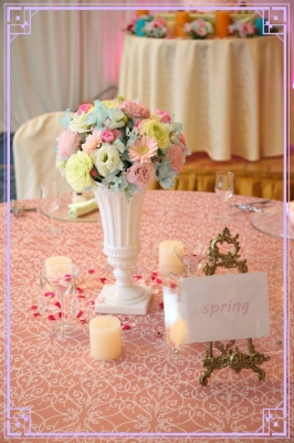JUGEMテーマ:ブライダルプランナー 会場を彩るのはもちろん新郎新婦 がしかし 会場の中に飾られるお花たちも、大切な1つ 新婦さんなら誰もが、ドレスの次に気になる所ではないでしょうか ということで、springをイメージした テーブル装花をご紹介します ピンクに白の柄が入ったのテーブルクロス お花は淡いパステル系で 白の陶器の器が、かわいらしさを台しています ちょっ...