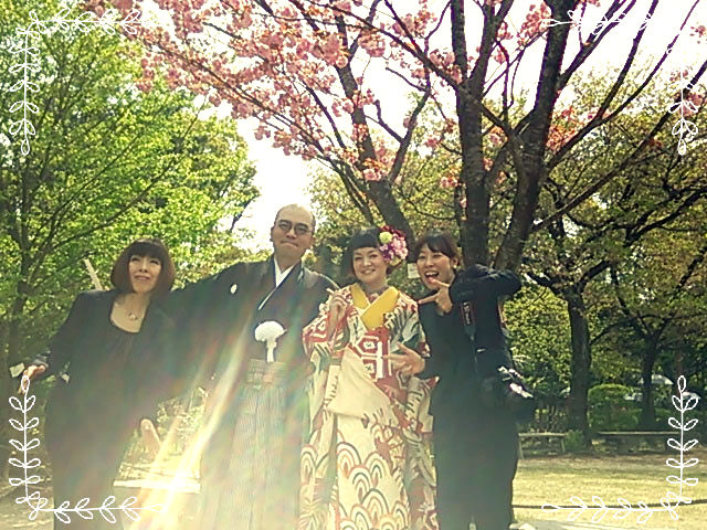 JUGEMテーマ:ブライダルプランナー ここ最近天候が好ましくなかったのですが 本日、晴天 最高の撮影&挙式&お披露目会でした まずは、撮影 今日の撮影は Photographerゆっきーと一緒です さすがに、桜は無理だろうと クルー&ギャラリー皆あきらめていたのですが お二人の日ごろの行いですね まだ、ちゃ〜んと咲いてくれていました 色打掛とっても素敵です ひさびさ、ゆっきーと二人で記念撮影 撮影も無事に終わり 今度は白無垢に着替えて、挙式に挑みます もち...