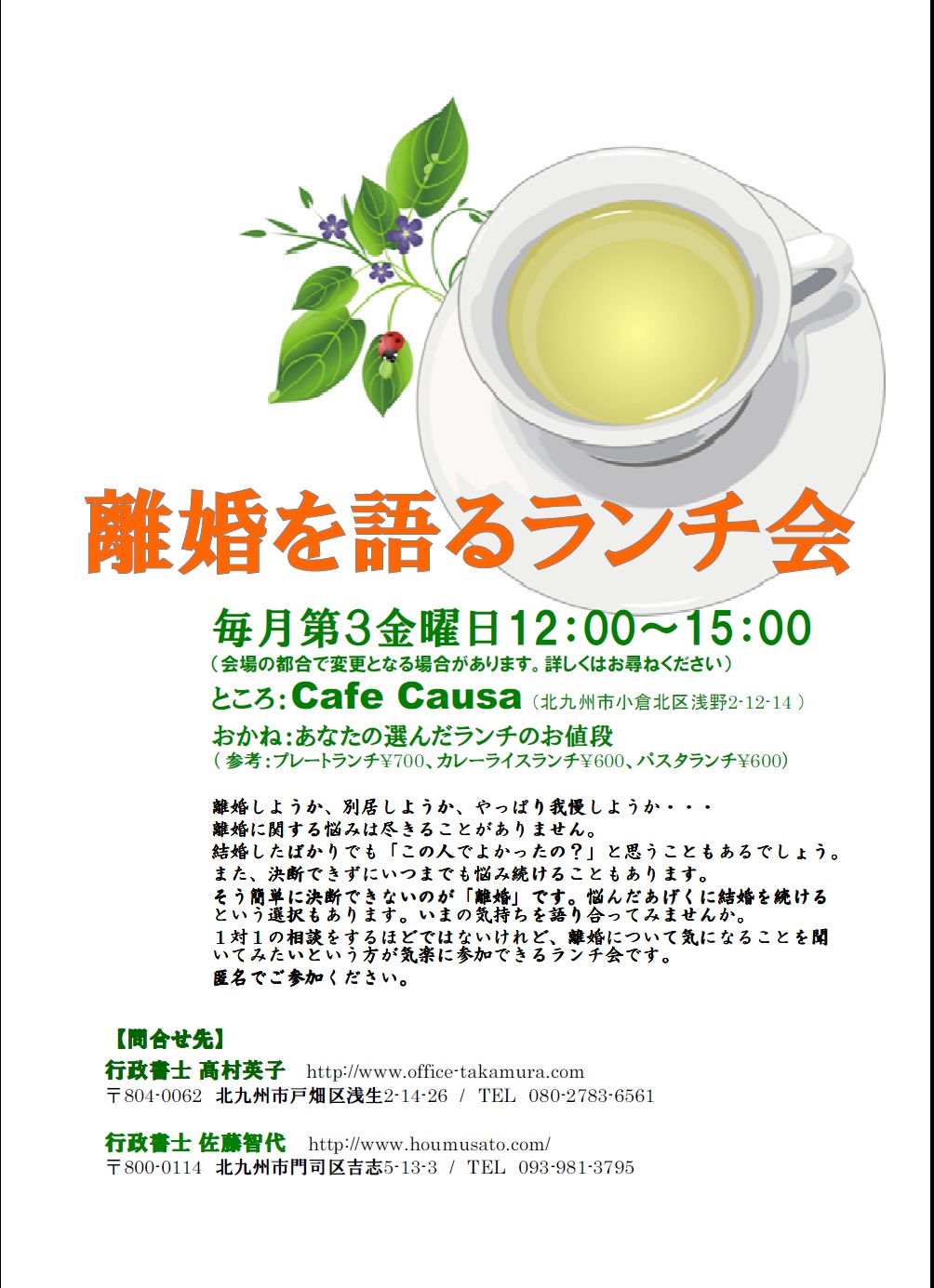 離婚のイベントの日程が変更になります。 4月から毎月第3金曜日に開催します。 離婚はこれまで築いた家庭を壊すこと。 決して積極的にお勧めするものではありません。 けれど、離婚でしかリセットできない人生もあります。 弁護士のところはちょっと敷居が高いという方、 具体的には考えていないけれど知識は持っていたいという方、 女性行政書士が対応いたします。 気軽にご参加ください。 匿名でご参加いただけます。 参加料はあなたのランチの料金のみです。 詳しいことは高村までお問合わせください。 電話 080-27...
