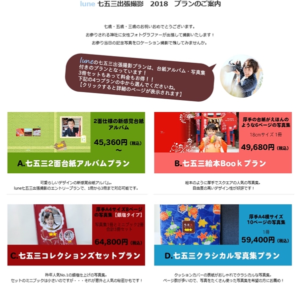JUGEMテーマ:家族写真 lune Information 6月もあっという間に下旬に。 秋の七五三の撮影のご予約受付を7月1日からと決めてから、 プラン内容やHPの更新など・・・ 間に合うかしら〜? っと ちょっと心配でしたが、 アルバムなどの商品は、 昨年と同様のラインナップにさせていただきました。 七五三の記念撮影を、カメラマンに出張してもらって 神社等での参拝当日の写真を残すのもいいかも〜っと 思った方は是非、HPをご覧の上、検討してみてください...