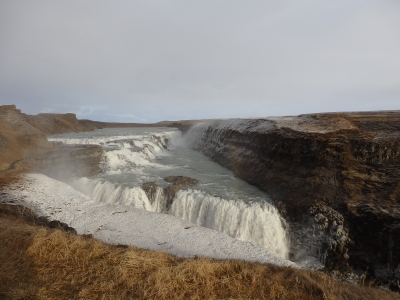ギャウを見たあとは、バスでグトルフォスへ。 まず見物をする前に、近くで昼食。 お土産屋さん兼食堂といった感じ。 いつも食べ物の写真を撮るのを忘れてしまうので、写真はないですが… とにかく量が多くて、しょっぱかった…! そして、ケーキはあまあま! あー、これが北欧の食事なのだな、と実感する。 そして、グトルフォス! ものすごい水量です。 アイスランドがTV番組で取り上げられるとき、必ず紹介される滝です。 気温はかなり低く風も強かったですが、この壮大さで忘れられます。 おじさん...