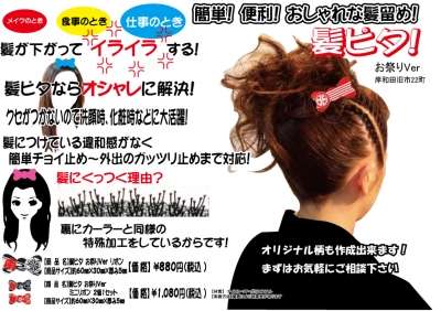 JUGEMテーマ:岸和田だんじり祭り 新発売しました!髪ピタ だんじり 祭り 仕様を 下記店舗にて取り扱い始めました。 是非一度ご覧ください。 大阪屋 有限会社 大阪屋 〒596-0053 大阪府岸和田市沼町6−15 TEL 072-422-2731 http://www.osakaya-web.net/00f-goods/goods-top.htm 髪ピタの詳細はこちら http://saisyoku.net/kamipita.html 発売元: だんじりグッズ 彩飾