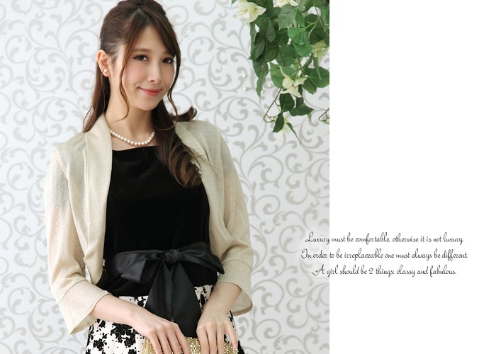 JUGEMテーマ:パーティ 装いを可愛く格上げするボレロ こなれ感漂うボレロ 結婚式やパーティーなどのドレスシーンに合わせたい華やかなパーティーボレロ シフォン生地よりも厚地で、ジャケットタイプよりも柔らかな着心地 ショート丈の着丈でウエストの位置を高く見せて足長効果も期待できます ボレロ:7,590円 カラー:ベージュ/ブラック サイズ:9号・11号
