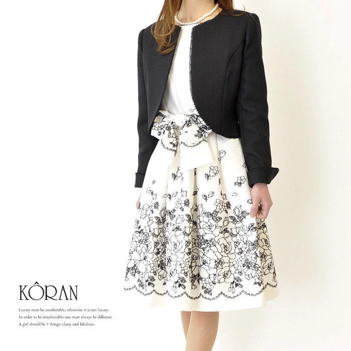 JUGEMテーマ:パーティ 大人可愛いムード漂うフォーマルスーツ すてきに着られる服 ボレロ風なショート丈のジャケットに量感あるスカートのワンピースを合わせた上品アンサンブルスーツ それぞれが単品の着回しとしても便利なデザインはコーランのオリジナルアイテム 袖のレースやワンピースのフロッキーなど、細かいディテールに「可愛い」を忍ばせ程良くフェミニンに上質感漂うモノトーン素材を使用した、品の良いデザインスーツです フォーマルスーツ:38,280円 カラー:ブラ...