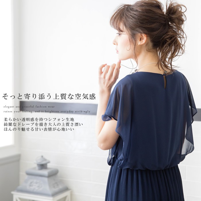 JUGEMテーマ:パーティ クリスタルプリーツが描く大人のドレープ エンパイアスタイルを より美しく 透明感のあるシフォンで肩から二の腕までを優しくカバー 切り替えブラウジングを効かせたハイウエストは足長効果と気になる部分のフォローの一人二役 繊細なプリーツですっきりとしたスカートのシルエットはトップスとのメリハリ◎ ほんのり透け感のある裾がフォーマルらしいエレガンスな印象に ロングドレスは安心感の時代へ パーティドレス:14,800円 カラー:ベージュ/ブルー...