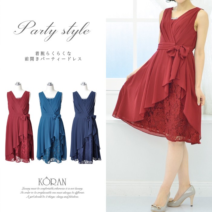 JUGEMテーマ:パーティ 大人可愛いフラワーレースが覗くアシンメトリー 体型を美しく魅せるデザインで、装いも気分も盛り上げてくれる膝丈ドレス 珍しい前開きタイプのドレスで気張らず着れて嬉しいデザイン ビジューが施されたカシュクールの胸元に 大人可愛いフラワーレースが覗くアシンメトリーのスカートは 軽やかに揺れ動くフォルムがドラマティックで、ぐっと華やぐ一枚です ありそうでなかった、前開きドレス 授乳中のママさんや、腕が上がらない方におすすめです。 パーティドレス...